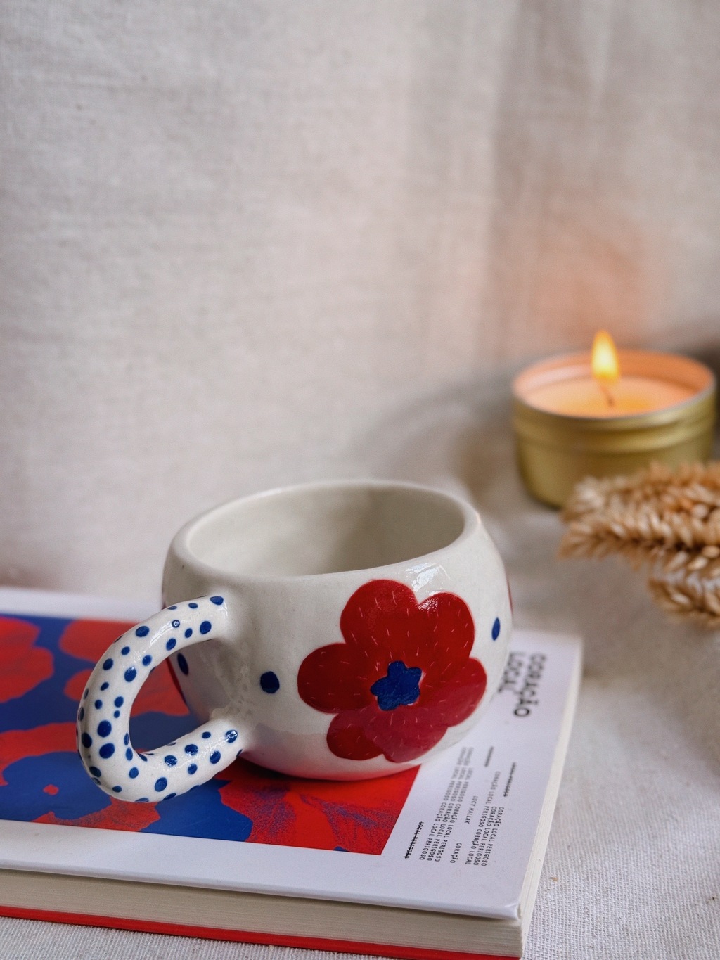 argila branca | esmalte transparente e detalhes em azul e vermelho